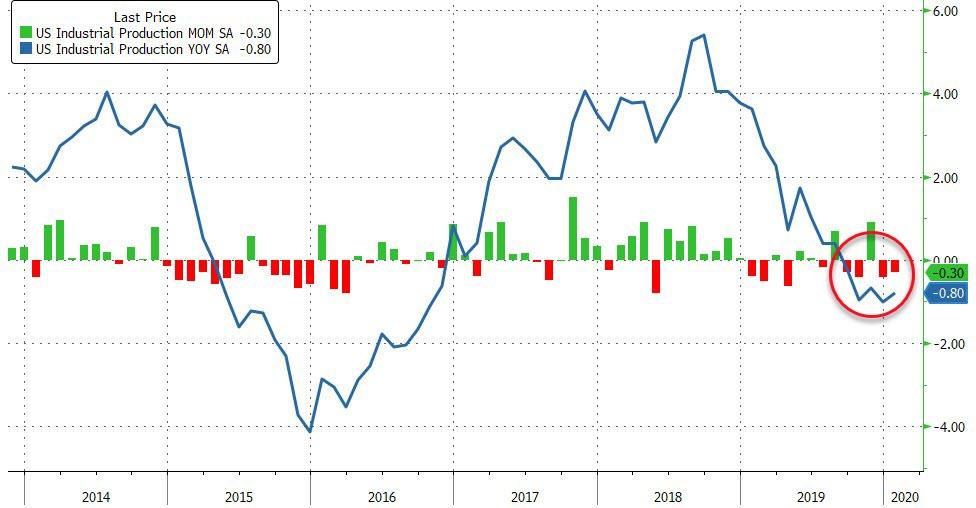 ZeroHedge - Feb 14th 2020 9:21am EST US Manufacturing Production Contracts For 7th Straight Month, Capacity Utilization Tumbles After falling for 3 of the last 4 months, and following Germany’s disastrous January print, US Industrial Production was expected to drop by 0.2% but yet again it disappointed, falling 0.3% MoM. Source: Bloomberg This means US Industrial Production has contracted year-over-year for 5 […]