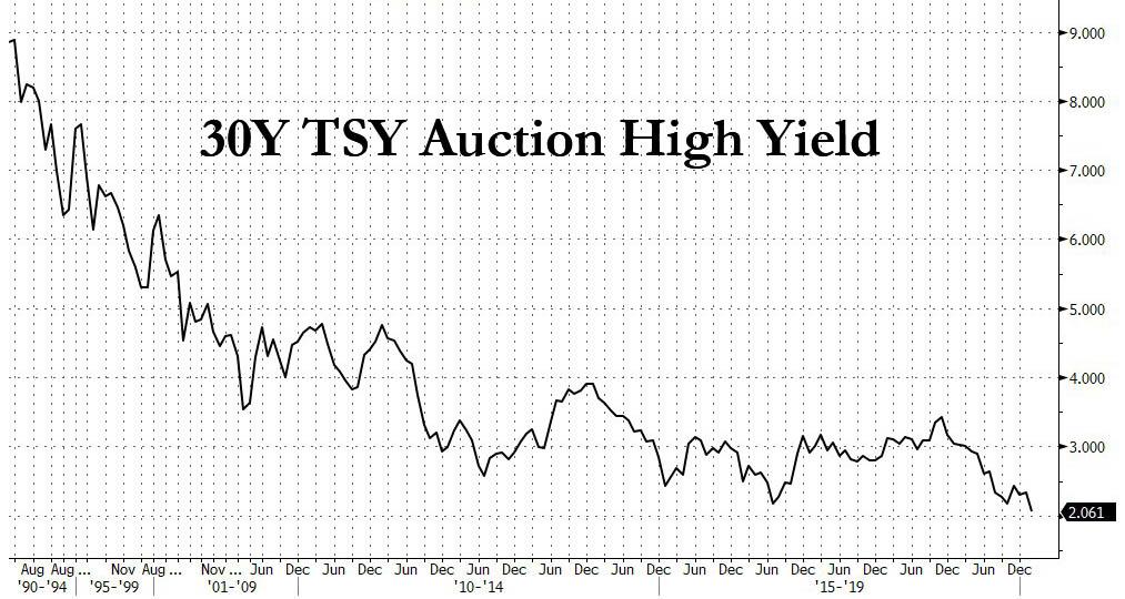 ZeroHedge - Feb 13th 2020 1:13pm EST 30-Year Auction Prices At Lowest Yield On Record One day after a solid 10Y auction, moments ago the US Treasury closed off the week’s coupon issuance with a bang, when it sold $19 billion in 30Y bonds with a bang, thanks to a high yield of 2.061%, which not only stopped through the When Issued […]