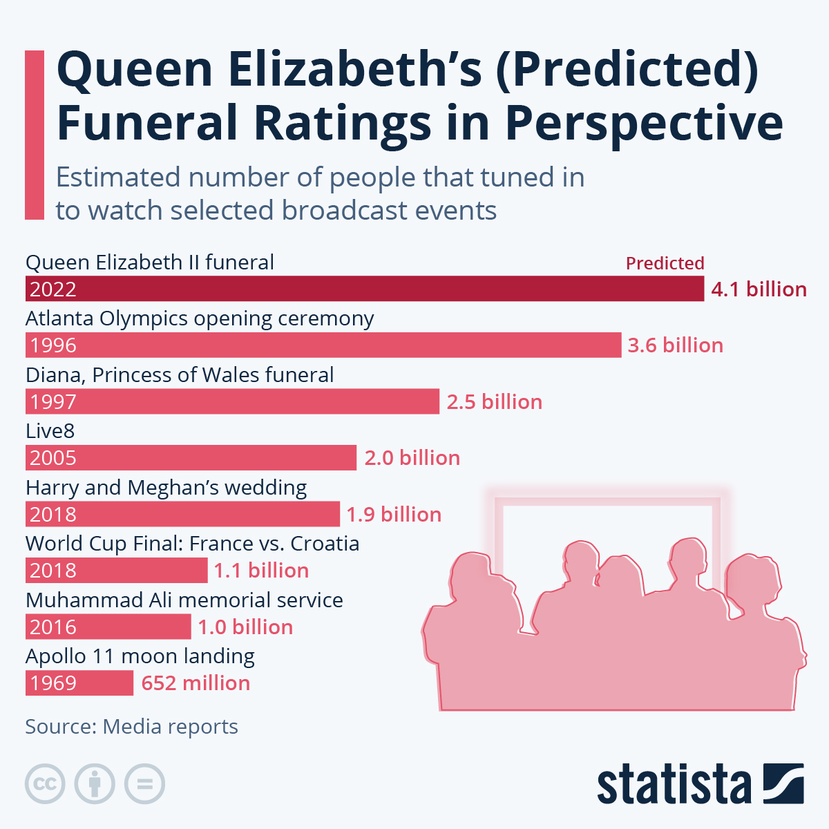 ZeroHedge - Sep 19th 2022 10:00pm EDT Queen Elizabeth’s (Predicted) Funeral Ratings In Perspective Queen Elizabeth’s funeral today is forecast to pull in more than four billion viewers worldwide today, breaking the record for the “most watched broadcast of all time”, according to media reports. As Statista’s Anna Fleck notes, if industry experts’ predictions are accurate, then the funeral will nearly double the UK’s […]