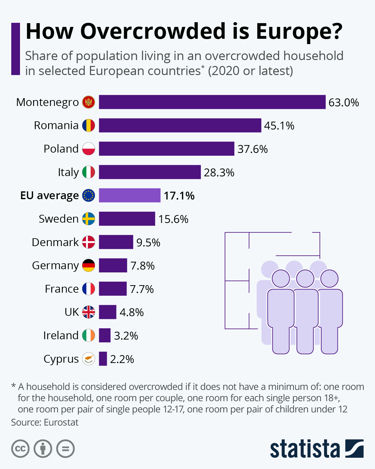 ZeroHedge - Sep 5th 2021 7:35am EDT How Overcrowded Is Europe? According to the latest Eurostat statistics, 63 percent of households in Montenegro are overcrowded. You will find more infographics at Statista According to the source’s definition, a household is considered overcrowded if it does not have a minimum of one room for the household, one room per couple, one room for each single […]