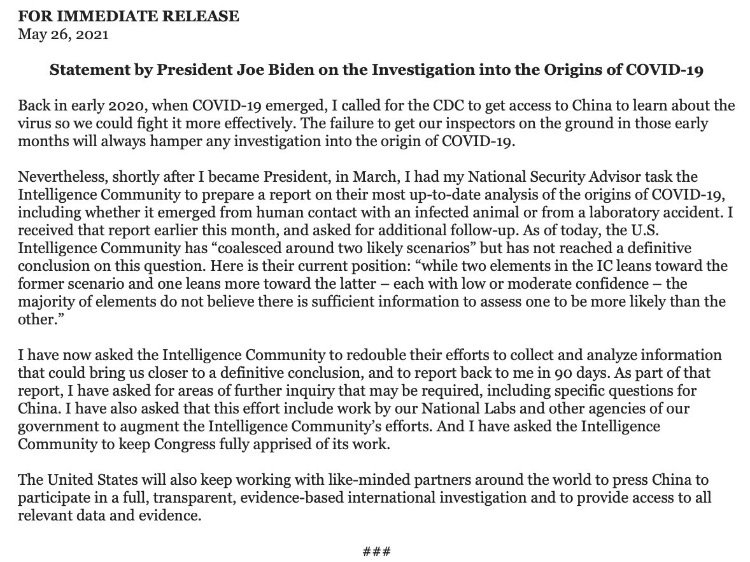 Infowars - May 27th 2021 6:00am EDTSleepy Joe admits that one intel agency is ‘leaning toward’ the lab leak scenario being most likely