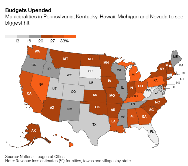 ZeroHedge - May 19th 2020 11:45pm EDT US Cities Will Lose $360 Billion From The COVID-19 Lockdown Tyler Durden Tue, 05/19/2020 – 23:45 The coronavirus lockdown in the U.S. is going to cost cities an astounding $360 billion in revenue through 2022, according to estimates from the National League of Cities. Pennsylvania is going to be hit the hardest, according to Bloomberg. The […]