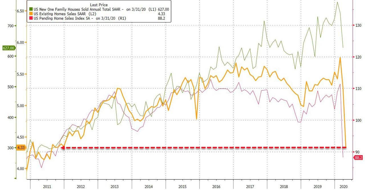ZeroHedge - May 21st 2020 10:05am EDT Existing Home Sales Continue Collapse To 9-Year Lows Tyler Durden Thu, 05/21/2020 – 10:05 Existing Home Sales in April plunged 17.8% MoM to the lowest SAAR since September 2011 (at 4.33mm, slightly better than the 4.22mm exp)… Source: Bloomberg This is the largest drop since the government’s homebuyer tax credit expired in July 2010 (the […]