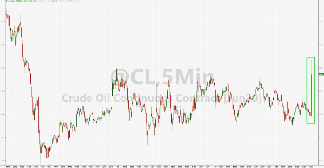 ZeroHedge - May 11th 2020 8:05am EDT Oil Spikes On Saudi Output Headlines Bloomberg reports that Saudi Arabia will unilaterally cut its crude oil output by 1mbd in June. The algos were fast to move WTI from $24 to $25.50… We will see how long this lasts. Tyler Durden Mon, 05/11/2020 – 08:05