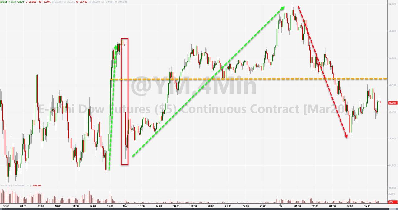 ZeroHedge - Mar 2nd 2020 7:55am EST Market Mutates Into A Harrowing Rollercoaster As Futures Soar Then Tumble A lot has happened since Friday’s cash close, which itself was a furious 600-Dow point squeeze on expectations of a coordinated central bank intervention… that never came. On Sunday night, US equity futures initially tumbled after Powell failed to satisfy rumors that he would […]