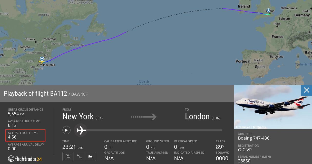 ZeroHedge - Feb 11th 2020 2:45am EST Storm Helps British Airways Break Transatlantic Record It takes a conventional passenger airliner 6 hours and 13 minutes to fly from New York to London on average, according to flight-tracking website Flightradar24. On Sunday morning, a British Airways Boeing 747 completed the journey in just four hours and 56 minutes, smashing the previous record for a conventional […]